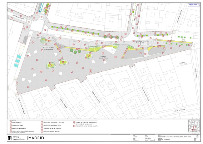 El Ayuntamiento adelantó las líneas generales de una reforma que «eliminará barreras arquitectónicas, fondos de saco y espacios inseguros y renovará el mobiliario urbano y los juegos infantiles» de Tirso de Molina, al tiempo que «supondrá una mejora ambiental de la zona gracias a la creación de más espacios verdes y la plantación de 46 árboles y más de 2.500 arbustos«. También, según el Consistorio, la reforma de las calles del entorno de la plaza «permitirá ordenar la movilidad y crear nuevas paradas de autobús para descongestionar Tirso de Molina y Jacinto Benavente».
