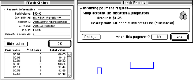 > Se ha demostrado por primera vez el pago desde cualquier ordenador personal a cualquier otra estación de trabajo, a través del correo electrónico o de Internet, utilizando la tecnología del dinero electrónico. "Se puede pagar el acceso a una base de datos, comprar un software o un boletín por correo electrónico, jugar a un juego de ordenador a través de la red, recibir los 5 dólares que te debe un amigo o simplemente pedir una pizza. Las posibilidades son realmente ilimitadas". [4]