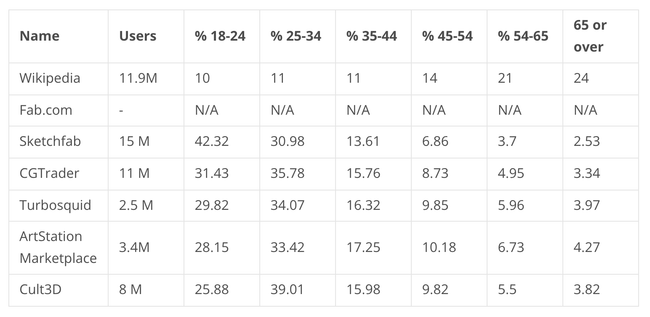 User demographics of Wikipedia and 3D marketplaces.