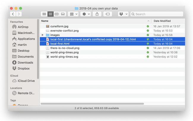 Most cross-device sync services also store a copy of the data on a server, which provides a convenient off-site backup for the data. These solutions work quite well as long as each file is only edited by one person at a time. If several people edit the same file at the same time, conflicts may arise, which we discuss in the section on collaboration.