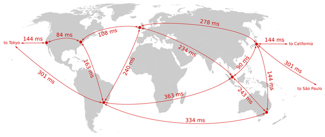 Server-to-server round-trip times between AWS datacenters in various locations worldwide. Data from: Peter Bailis, Aaron Davidson, Alan Fekete, et al.: “Highly Available Transactions: Virtues and Limitations,” VLDB 2014.