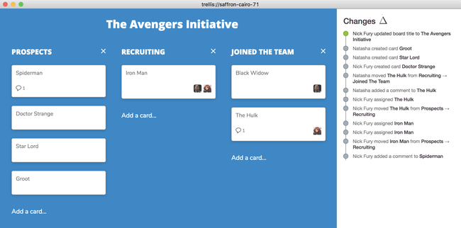 Trellis offers a Trello-like experience with local-first software. The change history on the right reflects changes made by all users active in the document.