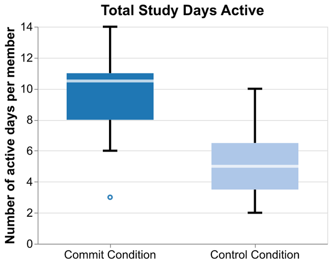 Groups in the Commit groups lasted longer, supporting Hypothesis 2 (Figure 6). Far more participants in the Commit condition had stayed active until the end of the study than the control: 87% versus 19%, a factor of over four times more. This means that over six times the number of control participants spent an entire week inactive compared to those in the Commit condition.22Participants are defined as surviving so long as they have no been inactive for seven days in a row. They therefore cannot “come back to life” by renewing activity in the future. Other survival measures suffer from the question of whether participants might start being active after the study period concludes.