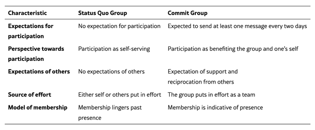 Through a three week field experiment, we observed that a commitment-based design encourages members to contribute more than a default reminder and encouragement scheme. The greater participation corresponded with greater group longevity and experiences of increased trust and comfort.