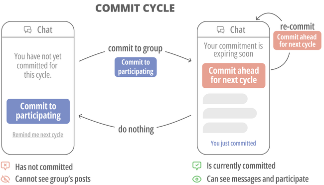 In response to these design guidelines, we designed a simple, recurring group commitment mechanism. Groups set particular expectations for participation on a periodic basis, for example posting once a week. In order to be in the group during a particular cycle and see the group content during that time, an individual is required to commit to participating during that cycle. The commitment cycle is synchronized across the group, starting and ending at the same time for every member to draw them into the group at the same time.