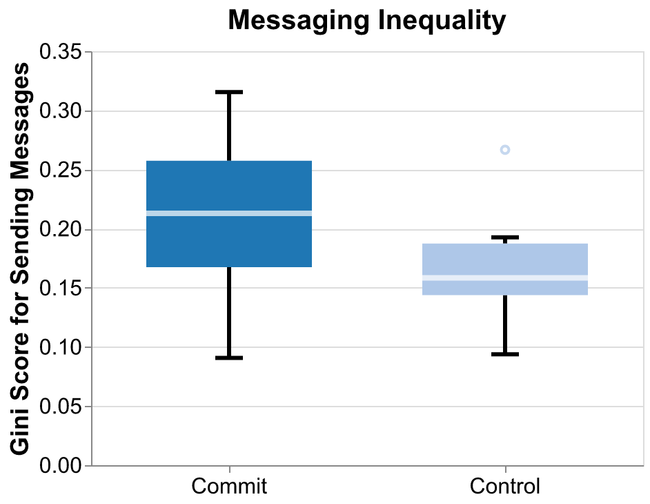 Figure 7.Comparisons of the equality of member contribution within groups for (a) all messages, and (b) messages initiating new conversations, each of which are measured across the entire study period. Inequality is measured using the Gini coefficient, for which higher values indicate greater inequality. Neither difference is significant, but we can see the directionality of the difference switch.