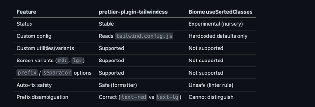 When to switch: Once useSortedClasses reaches stable status with Tailwind config file support, Biome becomes a clear upgrade. Track biomejs/biome#1274.