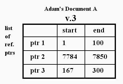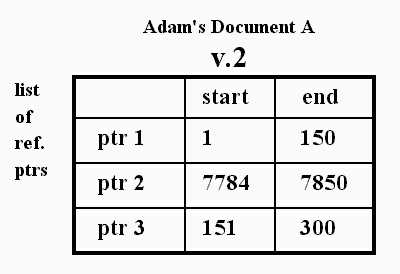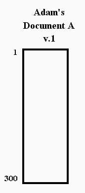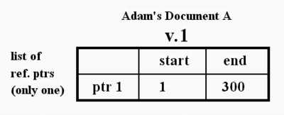 Suppose author Adam creates document A, version 1, which he publishes on line as the first document in this format. He publishes all 300 characters at once, causing these characters to be given consecutive universal addresses. The text contents of document A v.1 are therefore registered as having consecutive addresses from 1 to 300.