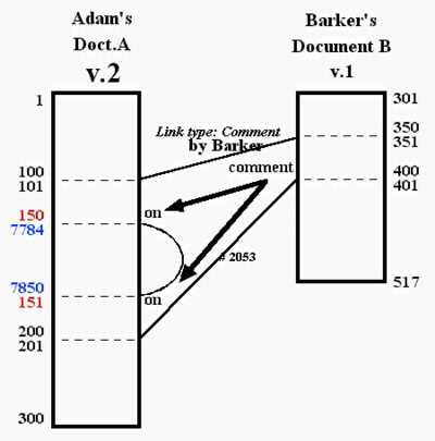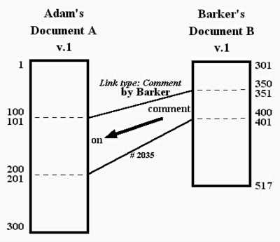 Suppose that in the text of Barker's document B, he has made a comment on Adam's document A. The text of the comment consists of characters 351 to 400; they comment on characters 101 to 200 in the middle part of A. While Barker's comment already resides in his text in written form, it gives no direct access to the material being commented on. So let us say that as the author, Barker chooses to make this textual relationship explicit, representing it as a comment link between those two spans (presumably using some comfortable visual editor to select the spans and specify the link type).