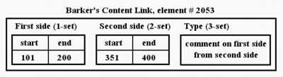 The internal structure of the content link has three parts (Figure 13): a list specifying the first side, a list specifying the second side, and a type designator. (These are called in xu88 the 1-set, the 2-set, and the 3-set.)
