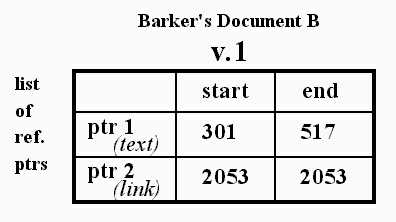 Now along comes a second author Barker, who publishes document B, version 1. The text contents of document B v.1 are registered as 217 consecutive bytes with permanent addresses 301 to 517, also an unbroken stretch of content bytes.