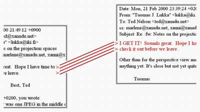 It has always been much more ambitious, proposing an entire form of literature where links do not break as versions change; where documents may be closely compared side by side and closely annotated; where it is possible to see the origins of every quotation; and in which there is a valid copyright system-- a literary, legal and business arrangement-- for frictionless, non-negotiated quotation at any time and in any amount. The Web trivialized this original Xanadu model, vastly but incorrectly simplifying these problems to a world of fragile ever-breaking one-way links, with no recognition of change or copyright, and no support for multiple versions or principled re-use. Fonts and glitz, rather than content connective structure, prevail.
