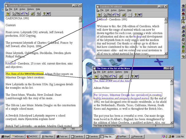 Fig. 5. Screen shot of transpointing windows by Ka-Ping Yee, showing his PYXI viewer served from Udanax Green server (xu88 model). Only transclusions happen to be shown, though PYXI also handles content links.
