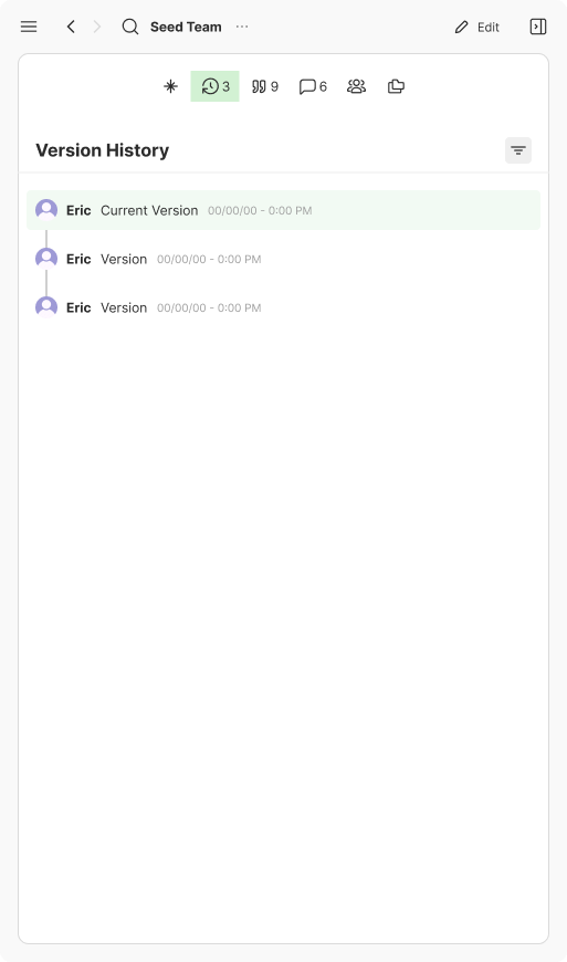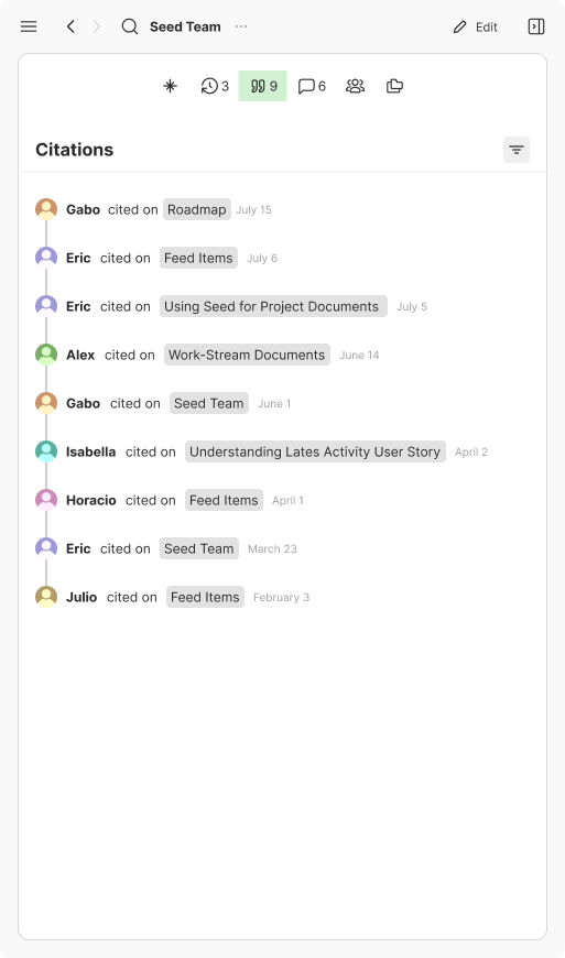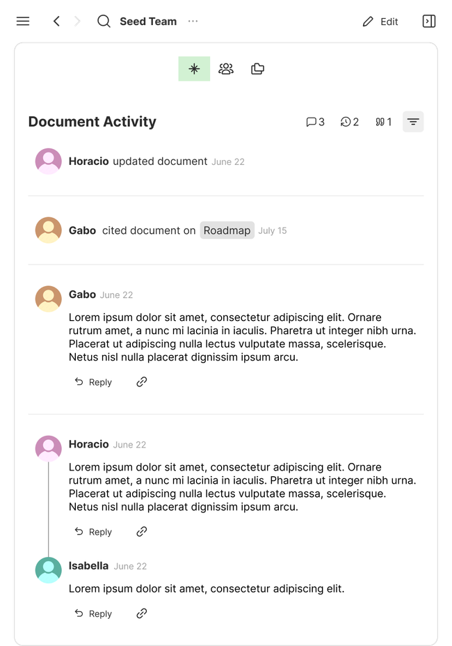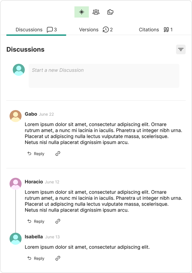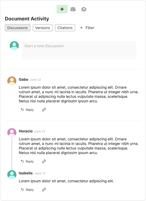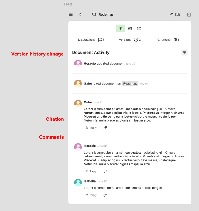 Document updates will represent the version history, citation on document will represent citations and comments and threaded blocks will represent discussions.