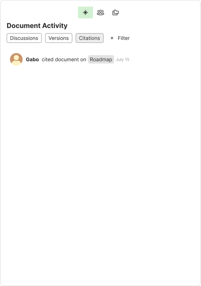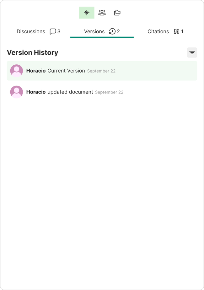 The activity panel will have 3 initial tabs the document activity feed, the collaborators panel and the directory. Version History, Citations and Discussions will be subtabs of the Activity Feed Tab. Commenting is a very important tool that we want users to use, this is why it can not be placed inside a filter as filters add complexity to the experience that many user will not use or understand. Due to this, basic experiences should be as easy to use and understand as possible.