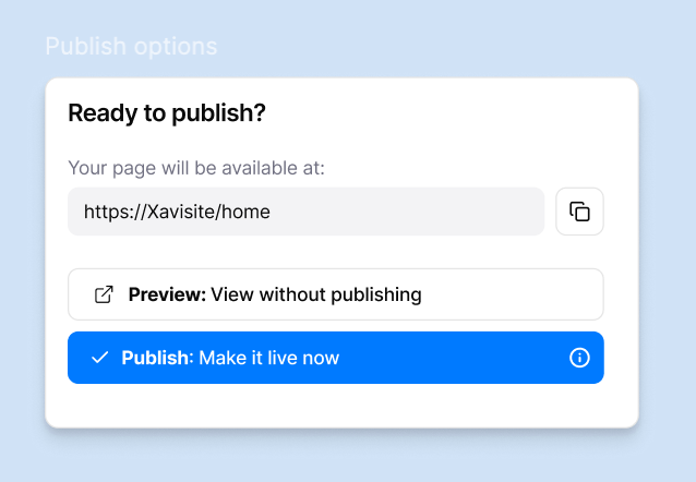 This dialog will open when users click the Publish button in the draft header document tools section. As you can see in the prototype, users will be able to see the URL that will be assigned to this document, copy the URL, see a Preview of how it will be visible AFTER we published and a confirmation button to finally publish it.