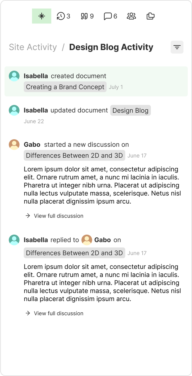 Users currently viewing a document's feed can only see activity specific to that document. The only way for them to see activity from the entire site is to go to the home document, which may not contain content they are interested in. They simply want to see the entire site's activity.