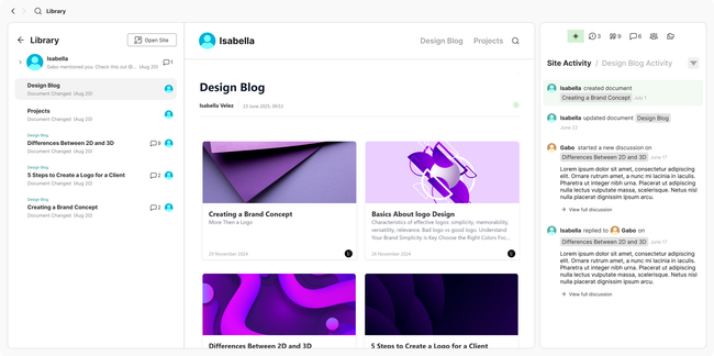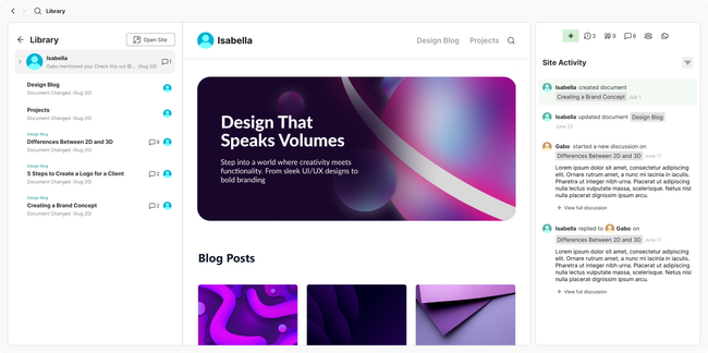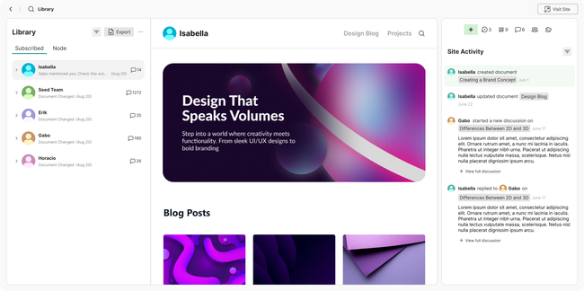 When clicking on a library item it should open the site in a reader mode with the directory displayed for navigation as well as the sites activity.