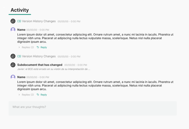 Documents show the discussion at the bottom but it is hard to see how this discussion relates to the document history and the activity of children documents.