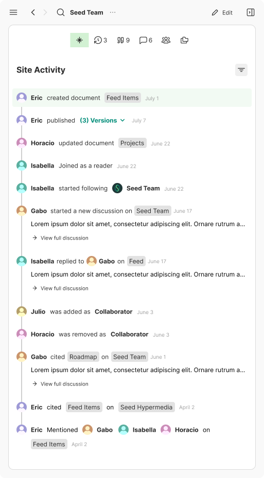 The items in the version history don't have constancy with the items in the all activity panel. The design should be unified so the element have consistency.