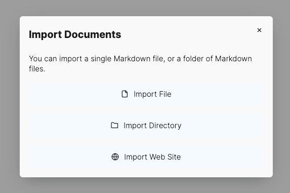 To get started click the "Import.." button in the document options dropdown, and select "Import Web Site"