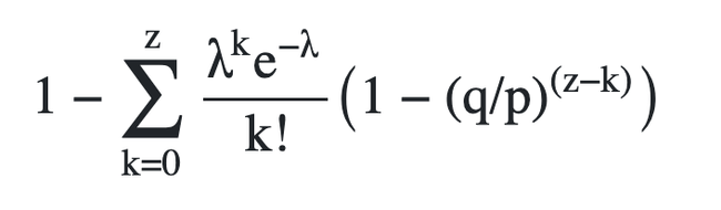 To get the probability the attacker could still catch up now, we multiply the Poisson density for each amount of progress he could have made by the probability he could catch up from that point: