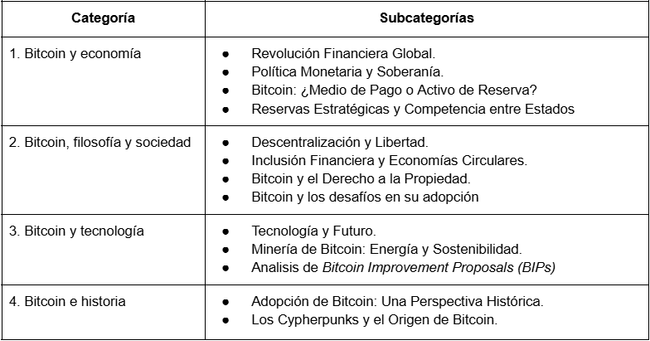 Categoría: ¿En qué categoría se enmarca su trabajo (Bitcoin y economía, Bitcoin, filosofía y sociedad, Bitcoin y tecnología, Bitcoin e historia)?