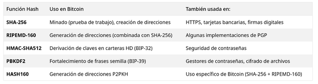 A continuación, una descripción de las funciones hash más relevantes en Bitcoin, junto con algunos de sus usos fuera del ecosistema: