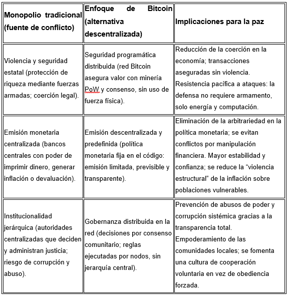Tabla 2. Monopolios tradicionales vs. enfoque de Bitcoin e implicaciones para la paz. Fuente propia 2025.