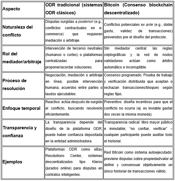 Tabla 1. Comparativa entre ODR tradicional y el consenso de Bitcoin. Fuente propia 2025.