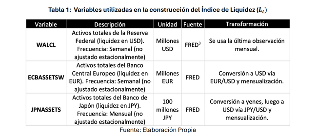 Primero, se construyó un Índice de Liquidez Global (2) Lt como un Z-score normalizado de los balances agregados de los bancos centrales (FED, BCE, BOJ), lo cual permite medir la presión cíclica de liquidez y las desviaciones extremas (expansión/contracción) respecto a su media histórica.