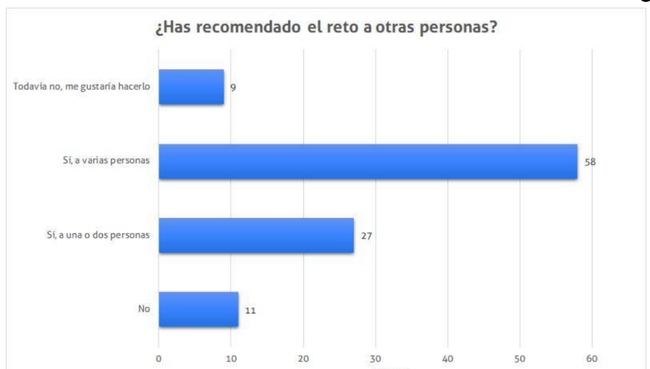 Ante la pregunta: ¿Has recomendado el reto a otras personas?, el 81 % de los encuestados respondió afirmativamente, lo cual demuestra un alto nivel de satisfacción y compromiso por parte de los participantes, como se muestra más abajo en la Figura 7.