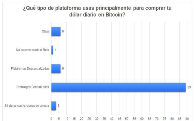 Ante la pregunta: ¿Qué tipo de plataforma usas principalmente para comprar tu dólar diario en bitcoin?, las plataformas más utilizadas fueron exchanges centralizadas como Binance, seguidas por billeteras como Lemon o Ugly Cash, y en menor proporción, plataformas descentralizadas (véase Figura 6). Las exchanges Binance, Bybit o Bitget obtuvieron 89 respuestas (85%), plataformas descentralizadas son usadas por 6 participantes de la encuesta (6%).