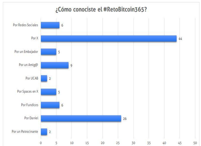 Ante la pregunta: ¿Cómo conociste el #RetoBitcoin365?, la mayoría de los encuestados conoció el reto a través de X (Twitter), seguido por redes sociales como Instagram y Tiktok, y por último, por medio de los embajadores de la iniciativa, véase Figura 5.