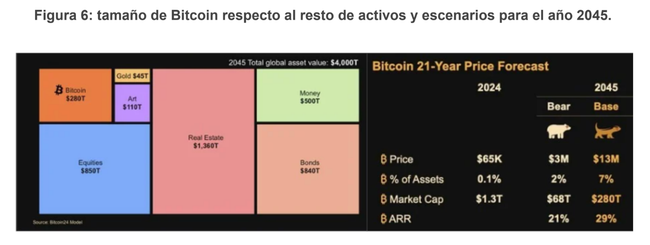 A partir de 2025, las conferencias de resultados de MSTR ponían a disposición del inversor una gran cantidad de contenido y explicaciones sobre las nuevas métricas, así como los diferentes escenarios para el futuro de Bitcoin. Dos de las imágenes más llamativas estaban relacionadas con la rentabilidad esperada anual de Bitcoin hasta el año 2045 y qué porción ocuparía en el total de activos mundiales. Lo curioso de estas imágenes es que en los escenarios realistas y pesimistas, Bitcoin obtendría unas rentabilidades anualizadas considerablemente inferiores a las pasadas, lo cual tiene sentido. Sin embargo, ocuparía en torno a entre un 7% y un 2 % de los activos totales en el mundo, lo cual, si valoramos a Bitcoin como un lugar donde aparcar cierta parte de nuestro patrimonio al margen de las garras del Estado, estos números no resultan en exceso descabellados.